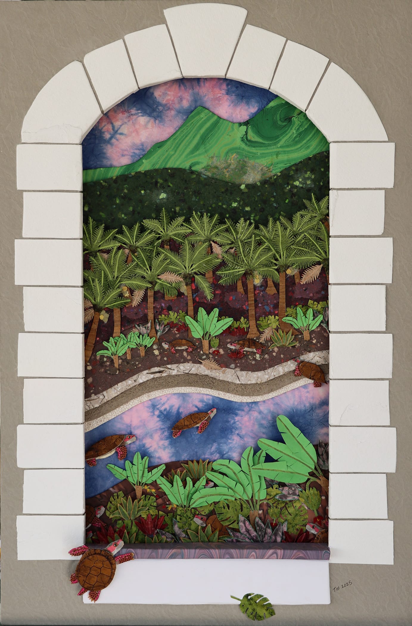 Paper Structures consist of layered papers cut, ripped, wrapped and fitted with mat board using paste, rice starch, and stainless steel nuts and bolts.